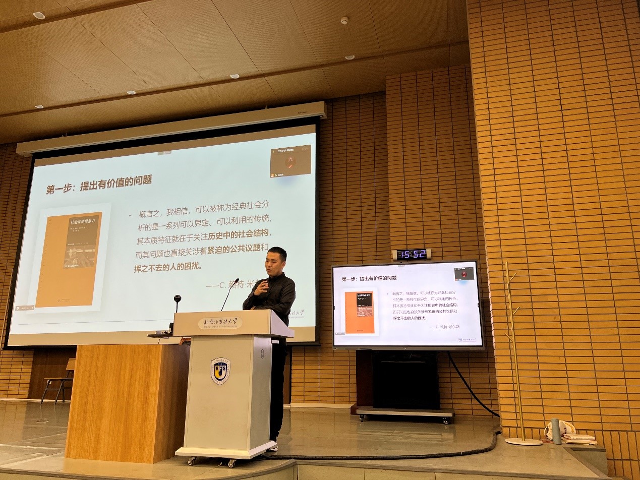 随后,beat365唯一官方网站青年教师释启鹏博士以《问题意识与学术规范》为题进行了详细讲解。释启鹏老师围绕问题提出、文献对话、分析框架、研究方法等环节就论文写作中需要注意的问题以及常见错误进行了阐述,鼓励同学们在介入经典理论对话中为当下重大现实问题提供新的解释。