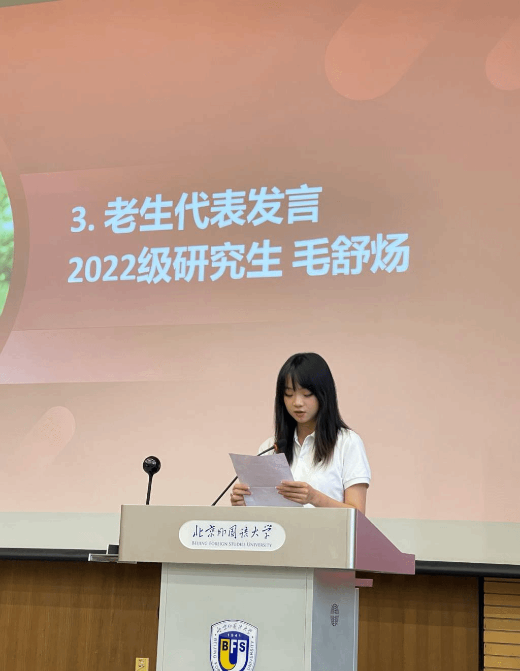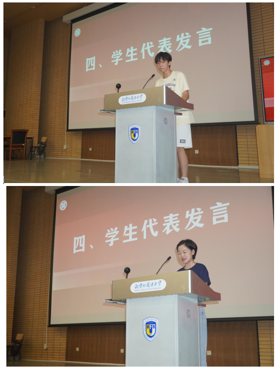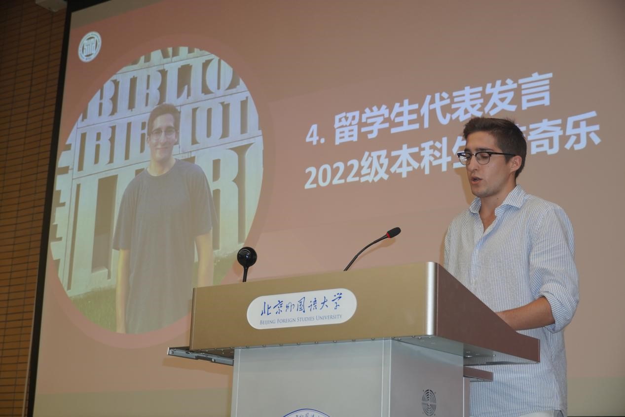 国际组织与全球治理专业本科生李雨积表达了对学院新设专业的理解与期待,号召同学们在北外勇敢寻梦、奋发向前。外交学专业硕士研究生邵一鸣回忆了自己在武警云南边防总队缉毒缉私的经历,表达出对北外的向往与热爱,呼吁同学们厚植家国情怀,开拓全球视野,锻造专业本领。老生代表2022级硕士生毛舒炀谈到,在北外这一共和国外交官的摇篮里,beat365唯一官方网站为中国外交事业发展做出了贡献,为同学们提供了发现自我、挑战自我、超越自我的极佳平台。2022级本科生留学生代表韩奇乐嘱咐同学们,要以积极的心态面对问题,灵活运用身边的资源进行语言和文化交流。