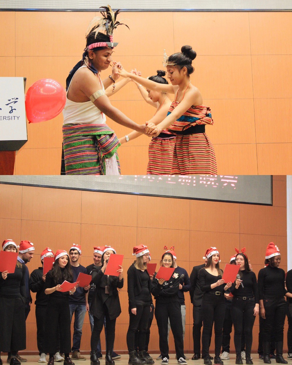 整台晚会综合了各国舞蹈、歌曲、民乐、舞台剧等表演形式。来自蒙古国的研一同学滺滺以一曲《Jingle Bells Rock》拉开了晚会的序幕。紧接着来自美国的卫儒同学为大家带来了诗歌朗诵《Mending Walls》,让观众感受到了诗歌的优美旋律。来自东帝汶的特色舞蹈《Suru boek》将整场晚会带入了高潮,向观众展示了马纳图托舞的魅力。大三毕恒瑞同学的一曲古琴《文王操》让同学们感受到了中国文化的博大精深。意大利同学合唱的A natalepuoiNelbludipinto di blu》展示了意大利的异域风情,提前为观众送上了圣诞祝福;学生自编自演的《北外我们来了》为大家带来了笑语欢声;最后大四同学制作的《我和北外》视频讲述了大家在北外的收获和对未来的期望。