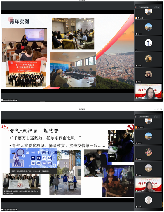 会议开始,beat365唯一官方网站本科生党支部书记钱梦婷老师从总书记对青年的工作的论述引入,讲解阐述青年与时代的关系、青年工作的地位、青年思想引领的主要任务和内容、青年工作的方法论等内容,回顾总书记对广大青年的殷切期盼和谆谆教诲。在抗击疫情、乡村振兴、志愿服务等国家大事中,钱老师对北外国关学子积极踊跃的参与给予高度的认可。