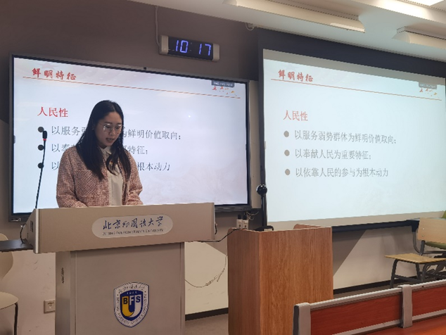 首先,刘昱东同学为大家展示了习近平总书记近年来对志愿服务所做出的一系列重要指示,将习近平总书记有关志愿服务重要指示精神的主要内容概括为志愿服务的价值、志愿服务的建设主体、志愿服务的建设路径三个方面,并对每个方面的内涵进行具体阐述。随后,林宇天同学进一步向大家介绍了习近平总书记有关志愿服务重要指示精神的鲜明特征和时代价值。习近平总书记相关重要指示与重要讲话有三个鲜明的特点,即人民性、问题导向性和系统性,对于新时代大力开展志愿活动、弘扬志愿精神具有重要的理论价值和实践意义。最后,林宇天同学向同学们做出呼吁,勉励学院党员同志发挥好先锋模范作用,团结带领身边广大青年学生积极投身志愿服务事业,为党和国家的发展贡献青春力量。