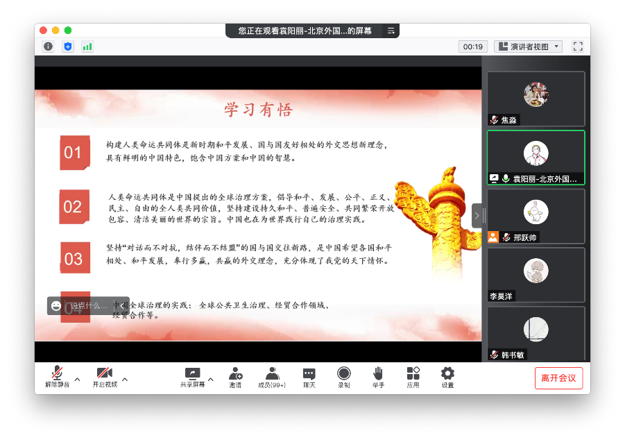 其次,关于人类命运共同体主题,李彦德同志从国际主义角度分析了人类命运共同体思想的内涵,包括正确义利观,区域命运共同体和新型全球治理观,提出新时代中国特色社会主义的国际主义观是对马克思主义国际主义思想的继承与发展。聂晓旭同志则是从共同抗疫角度分析了人类命运共同体对于全球卫生安全发展的重要性,尤其是在后疫情时代下如何弘扬全人类共同价值的问题。此外,胡宇杰同志结合天下大同思想,分享了自己对于人类命运共同体理念的理解,认为其为优秀中国传统文化的外延和时代性创新,将“和而不同”理念拓展到了追求人类共同价值高度。