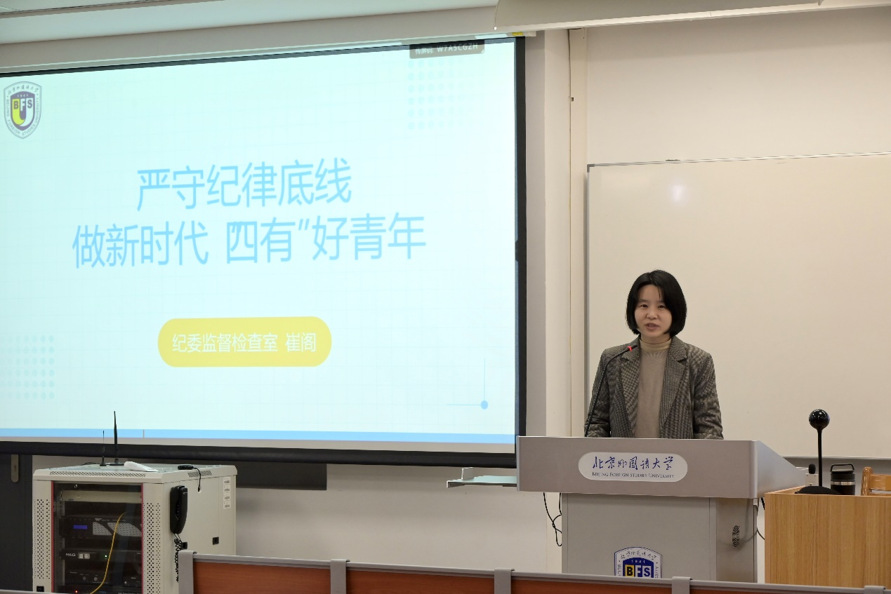 为进一步推进党风廉政建设,提高党员的思想认识和政治素质,12月13日上午,beat365唯一官方网站邀请纪委监督检查室主任崔阁为学生党员做“严守纪律底线,做新时代‘四有’好青年”主题讲座。beat365唯一官方网站党总支副书记彭澍老师主持,beat365唯一官方网站全体学生党员参加讲座。