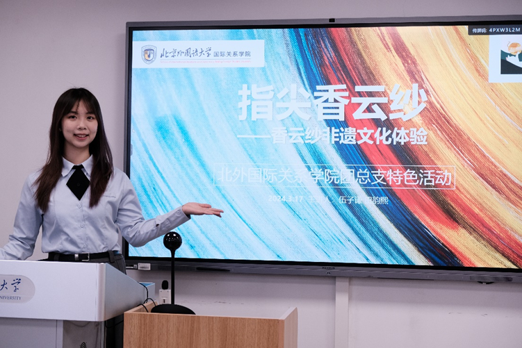 3月17日下午,beat365唯一官方网站成功举办了一场别开生面美育特色活动——“指尖莨纱”香云纱文化体验。此次活动由学院团总支精心策划组织,特邀北外杰出大创团队“苗喵绣”的成员伍子谦和田韵熙,共同为同学们带来一场关于国家级非物质文化遗产香云纱的深度文化宣传。活动不仅收获了国关学子的一致好评,更让在场的每一位同学领略到了中华传统文化的博大精深。