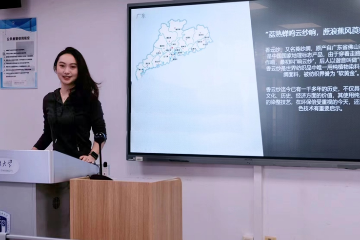 活动伊始,伍子谦和田韵熙两位同学为同学们细致地介绍了香云纱的起源、发展历程、制作技艺及其在当代社会的应用场景。他们的讲解如同一幅缓缓展开的历史画卷,让同学们仿佛穿越到了那遥远的年代,亲身感受着这一古老文化的独特魅力。在讲解过程中,同学们对香云纱产生了浓厚的兴趣,纷纷表示对这一传统工艺有着更多的好奇与探索欲望。
