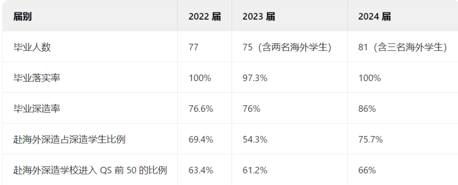 迄今为止,已有三届共233名同学从本项目毕业,平均毕业落实率达到99%,呈现出升学率高、升学质量高、就业多样化的特点。平均近80%的学生选择继续深造,其中赴海外深造的学生多数就读于QS排名前50的高校,包括剑桥大学、伦敦政治经济学院、哥伦比亚大学、宾夕法尼亚大学、约翰霍普金斯大学、新加坡国立大学等,而选择在国内深造的学生几乎全部进入国内知名高校,包括北京大学、清华大学、中国人民大学、复旦大学等。学生就业领域广泛,涵盖国家部委(如外交部、安全部、全国人大机关事务中心)、地方政府(如上海宝山区组织部和郑州税务局)、新闻媒体(如新华社和凤凰卫视)、非政府组织及智库(如太和智库)等。